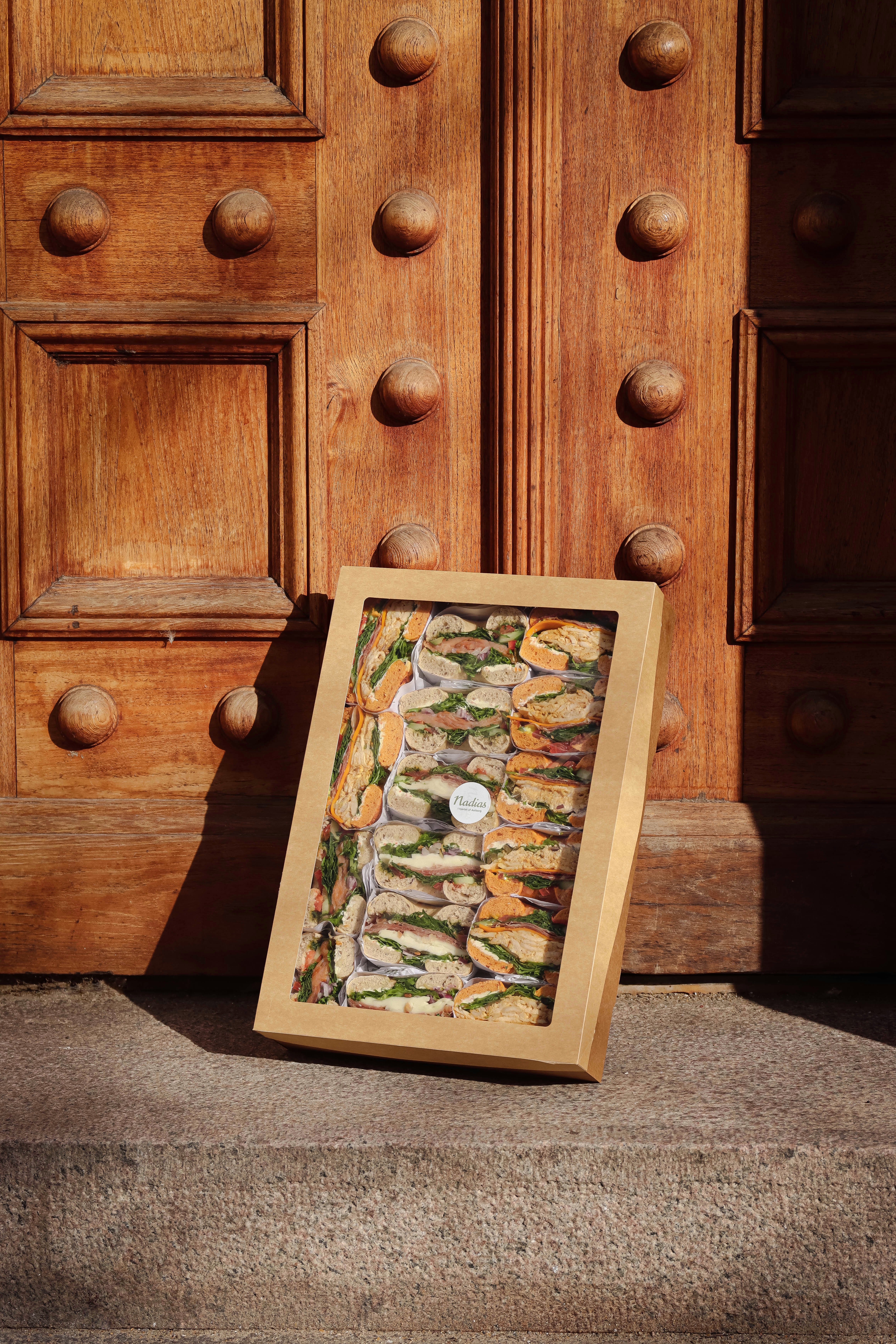 Nadias luksus box er designet til dig, der ønsker en lækker og praktisk madoplevelse til store og små arrangementer. Med vores udvalg af delikate Luksus bagels, der er halveret og elegant anrettet i en box, får du en fryd for både øjne og smagsløg. Uanset om du skal på arbejde, have besøg af kolleger eller planlægge en hyggelig picnic, er Nadias Luksus box det ideelle valg dig.